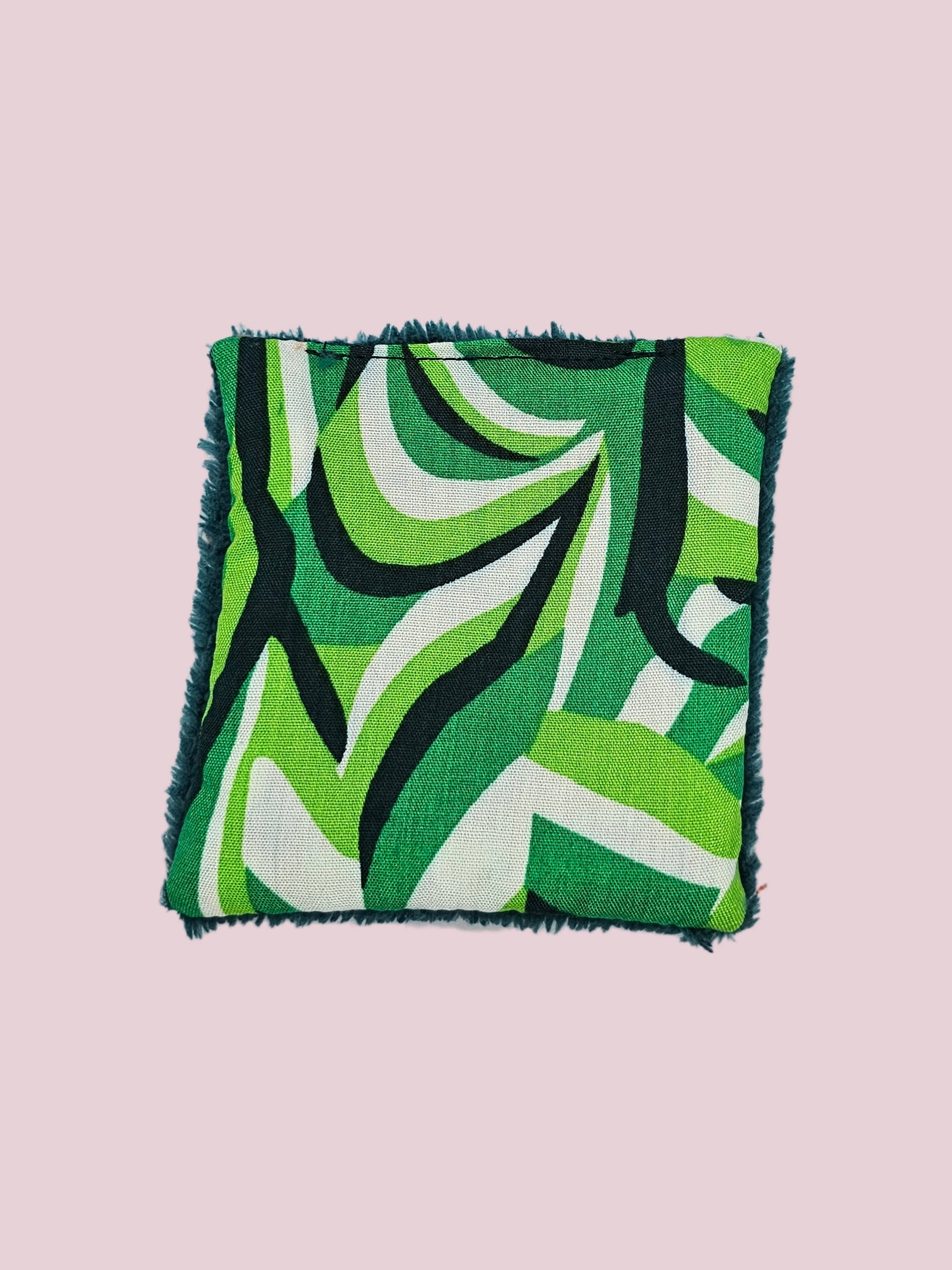 La partie absorbante est fait à base de bambou et la partie decorative est issue d'une chute de tissus et en l'occurrence d'un tissu vert à motifs
