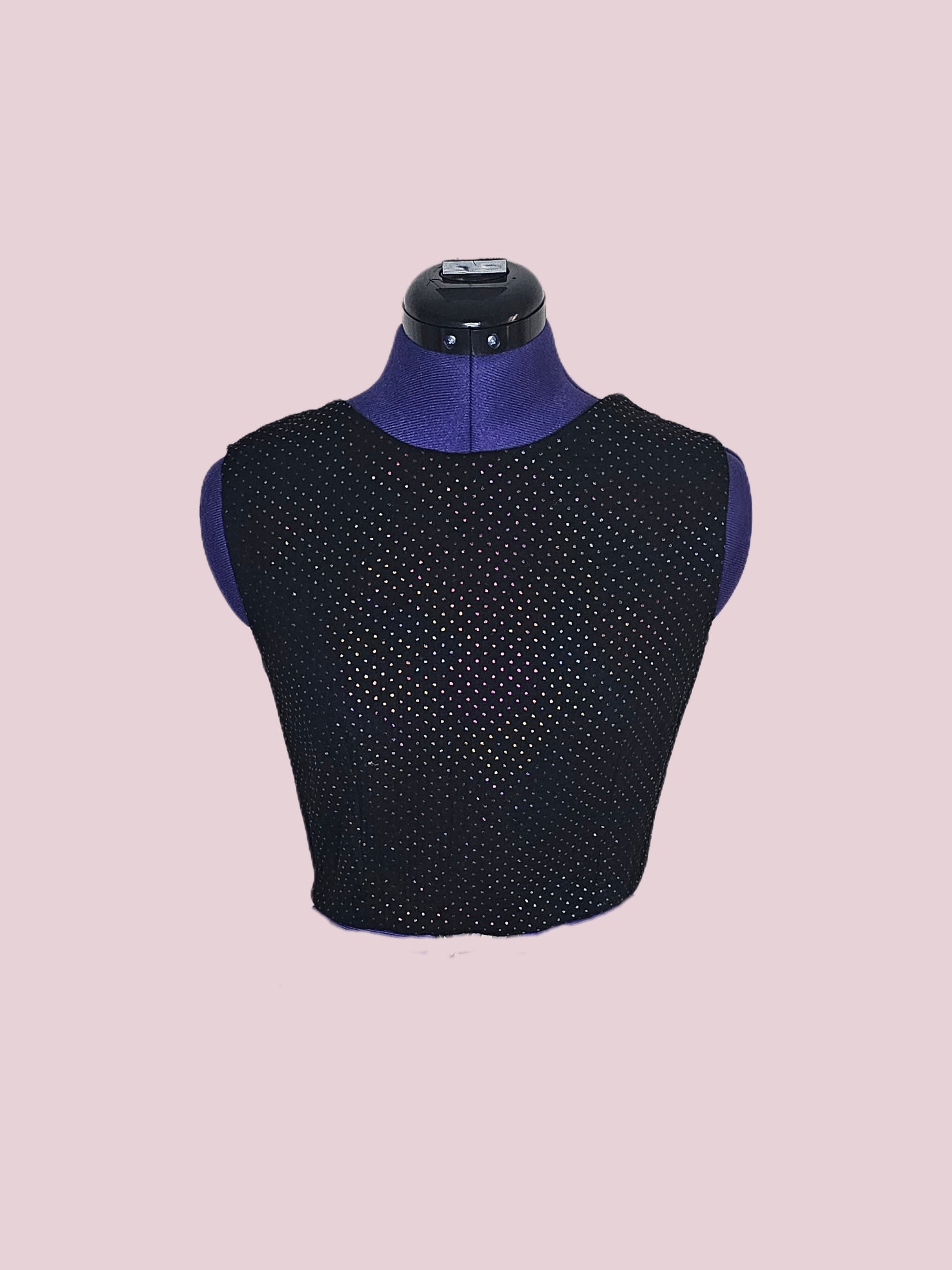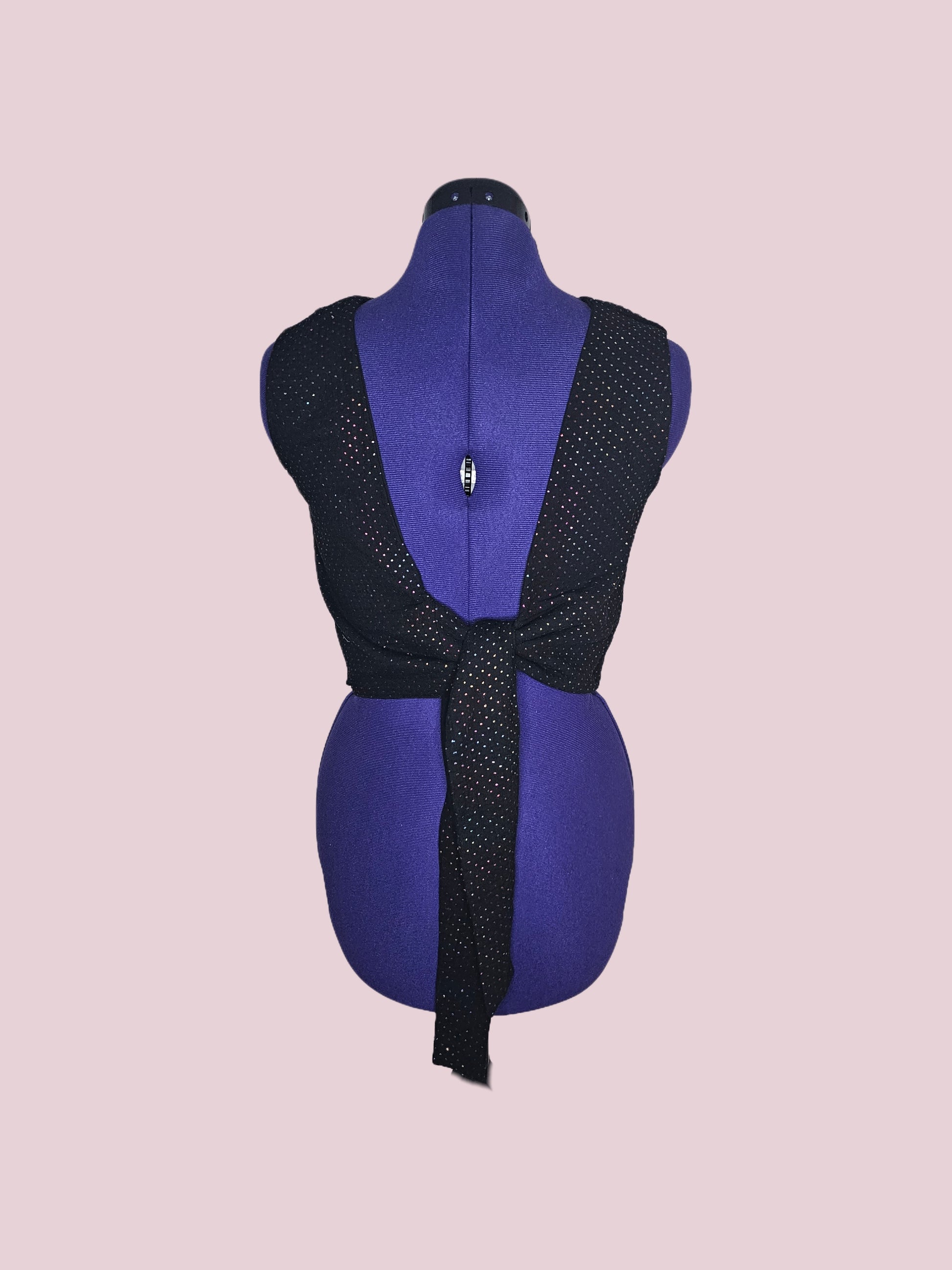 Le top Lexith est un haut en coton noir à paillete multicolore, il s'arrête à la taille et possède un dos nu qui se ferme avec un noeud.